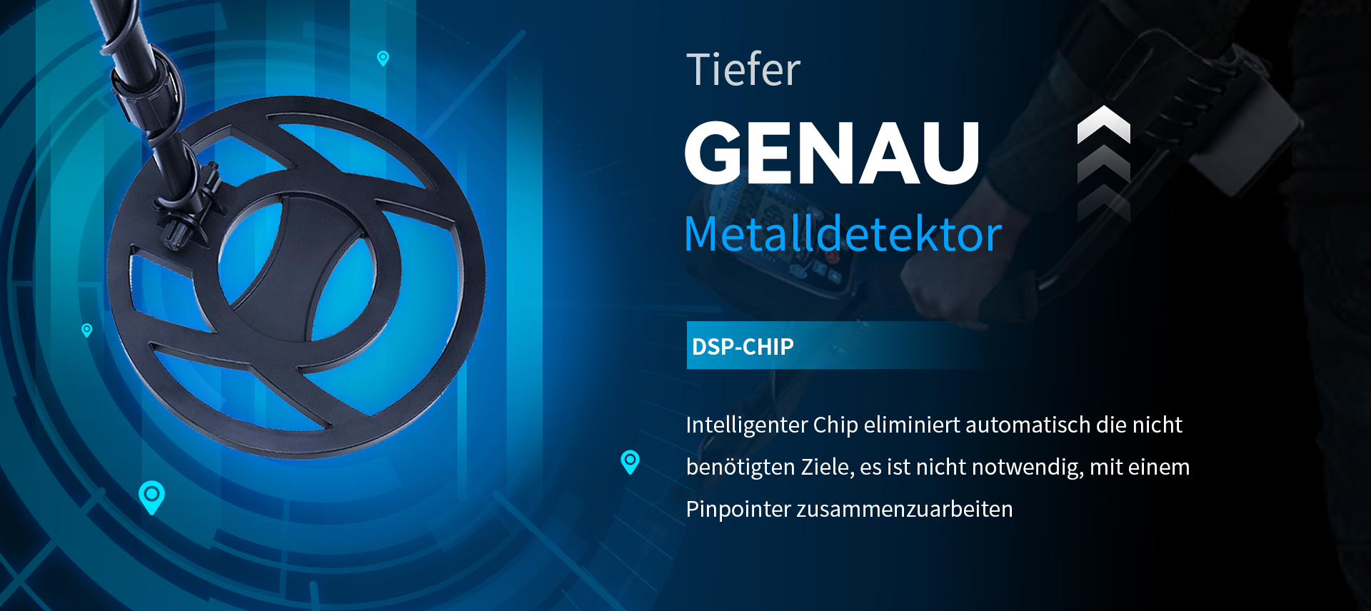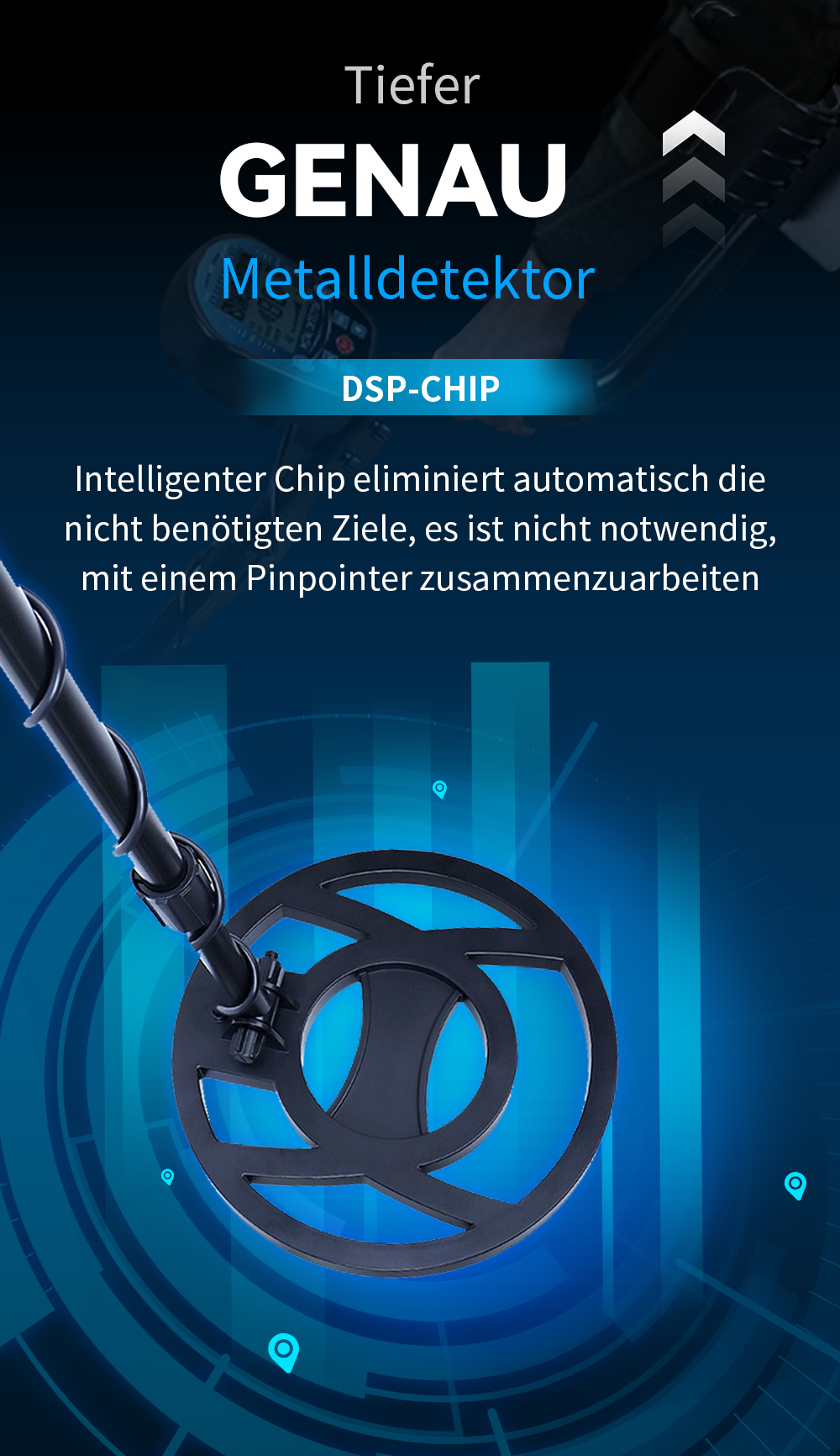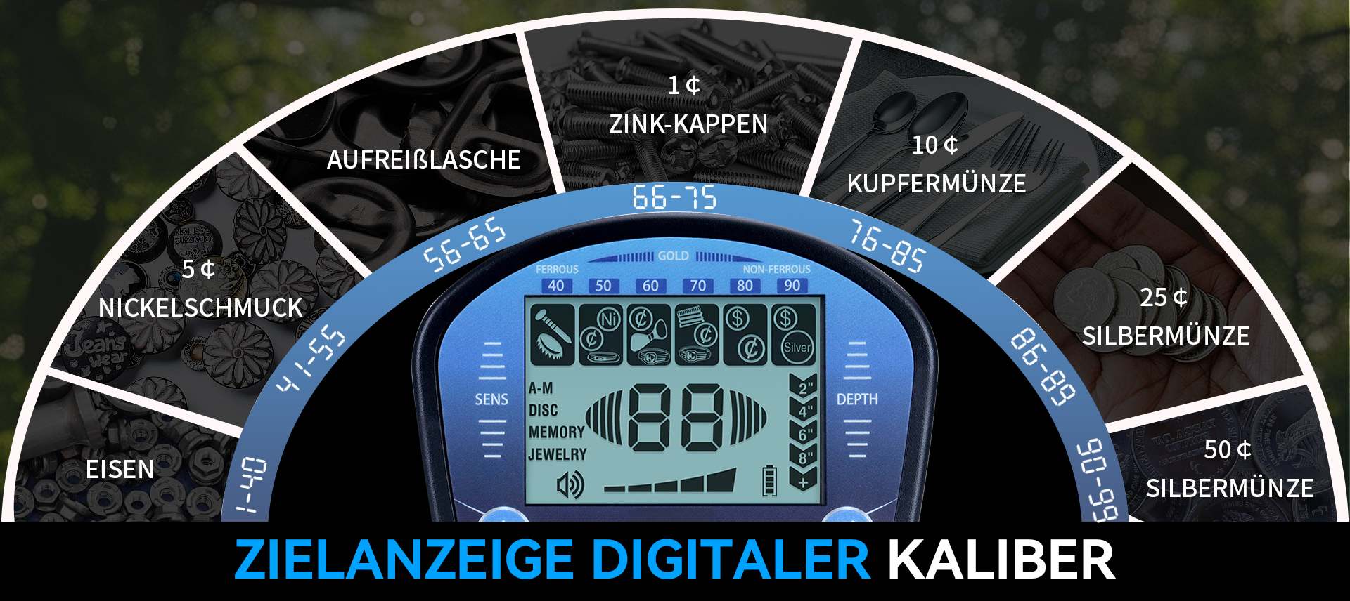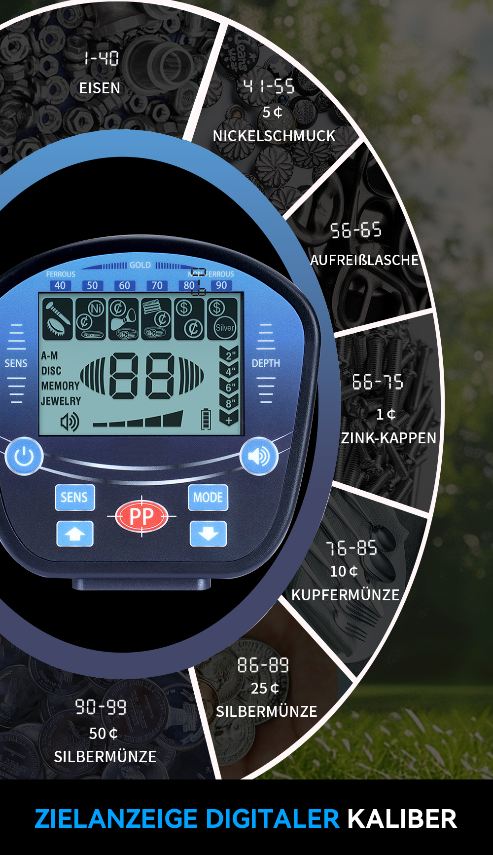 - Fünf Erkennungsmodi: All-Metal-Modus, benutzerdefinierter Modus, Speichermodus, Schmuckmodus, Identifikationsmodus.
